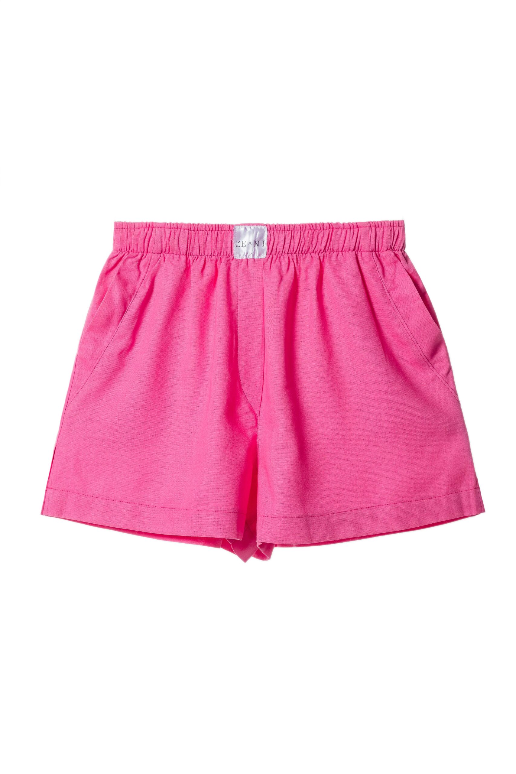 מכנסי פשתן קצרים בצבע ורוד עם גומי במותן וכיסים בצידי המכנסיים .